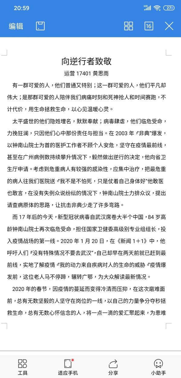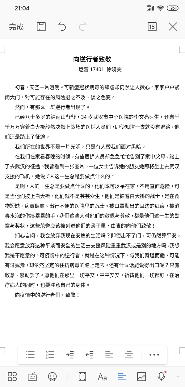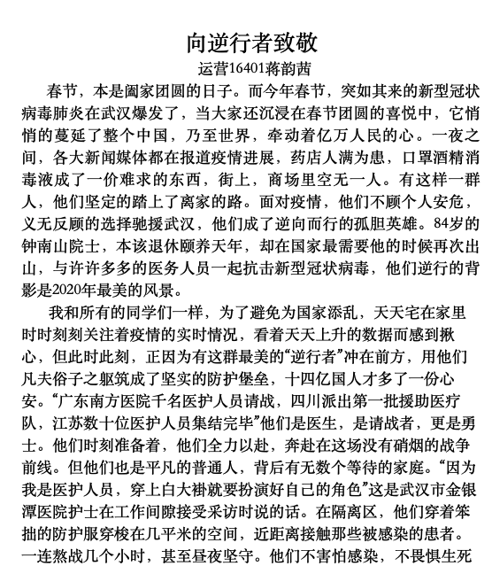 运营17401班黄思雨同学写道:在凛然严冬中,如钟南山一般的逆行者毅然选择奔赴最前线,在那个没有硝烟的战场,他们不惧险难以血肉之躯为你我撑起生命的屏障。他们或许并非身怀异禀,却有一颗炽热而执着的心。他们一个个远离他们的家人,远离他们的孩子,去为那些不认识的陌生人,去救助他们的生命,这就是白衣天使——医生。