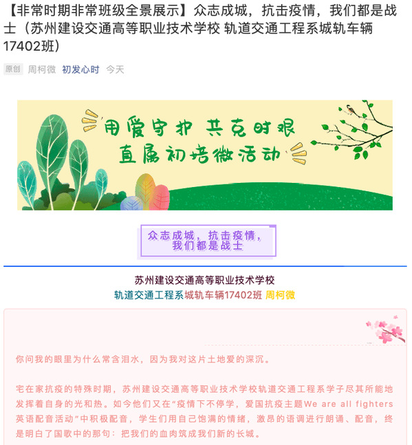 此非常时期的非常班级全景展示入选3月25日公众号“初发心时”推送。(图/ 周柯微 文/刘娇)