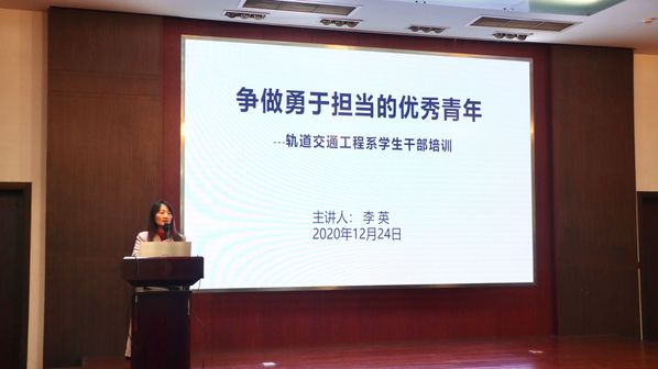 为了进一步提升学生干部的综合素养和业务能力,更好地发挥学生干部的引领作用,并通过以点带面整体提高整个学生队伍的综合素养,轨道交通工程系于2020年12月24日下午在报告厅东厅开展了《争做勇于担当的优秀青年》的学生干部培训,本次培训由轨道系副主任李英主讲,轨道交通工程系全体学生会干部参与。