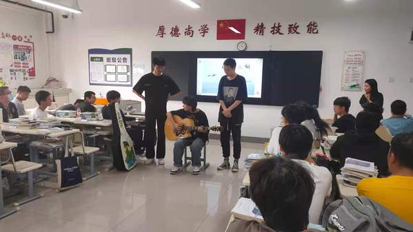 赵金鑫同学向同学们推荐了励志大师史蒂夫·钱德勒的《自我激励的100种方法》,讲述了“生命中的战斗士”尼克·胡哲的事迹,让同学们感受到了残疾人的温情、正能量。赵连华同学以“工匠精神待事业”为主题,为同学们解释了什么是“工匠精神”并以“蛋雕艺术”为例,展现了禽蛋艺术品之美。“蛋雕手艺人”张晓萍将传统蛋绘变成人们更容易接受的观赏性艺术品完美诠释了工匠精神,赵连华同学展示了同学们的实训经历,分享了对工匠精神的感悟。葛苏军和李强同学根据自己真实的经历,表达了自己平衡关系收获友谊的心得,并通过游戏“猜猜我是谁”说明友谊对人生的重要性。糜佳晨同学总结了同学们生活中得到幸福快乐的方法和途径,认为善良,奋进,爱好,荣誉,友情和坚持是同学们幸福的来源,并希望大家都能做个心灵富足的人。糜佳晨、张心越、蒋励成三位同学还进行了吉他弹唱《理想三旬》,升华了整堂课的主题。班主任周柯微老师最后对本次班会进行了总结。