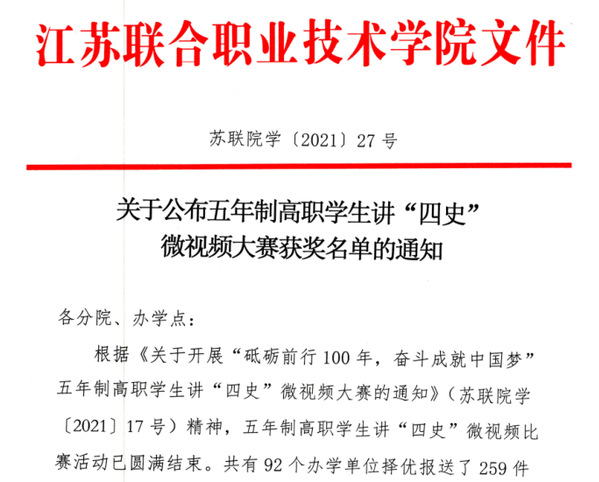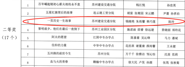 近日,江苏联合职业技术学院下发《关于公布五年制高职学生讲“四史”微视频大赛获奖名单的通知》,由轨道交通工程系陈玲老师指导,钱晓艳、朱雨馨和韩巧莲三位同学精心创作的参赛作品《一页历史一生故事》,在全院259件参赛作品中脱颖而出,喜获二等奖,系部在此表示热烈的祝贺。