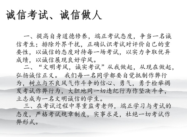 全体班主任动足脑筋,精心准备,有的制作了精美的ppt,通过案例开展班会课;有的是发起讨论话题,同学们积极发言,一致表示要严格自律,诚信考试;有的是通过集体宣誓的形式,营造了浓浓的诚信氛围……各班形式多样,主题鲜明,效果明显。