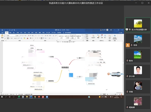 首先,陈玲老师、朱小芹老师和程焰钢老师分别就各自的备赛情况在会上进行了分享,重点讲解了工作案例、建班方案和主题班会。随后与会人员对两位参赛教师的前期准备工作进行了深入研讨,对其中的很多细节进行了打磨。李蒋主任建议要加强案例凝练,站在一个更高的理论视角,进行系统设计。在语言表述方面可以更加精炼一些,避免故事讲述场景频繁切换。汪丽丽处长建议参赛教师要深入研读参赛文件,多学习和借鉴高水平的工作案例,提升认识水平,努力建构自己的框架体系,力争使主题班会和案例更具典型性。李英副主任建议大家在建班方案和案例写作时,要关注内容内在的逻辑性和关联性,突出专业特色。