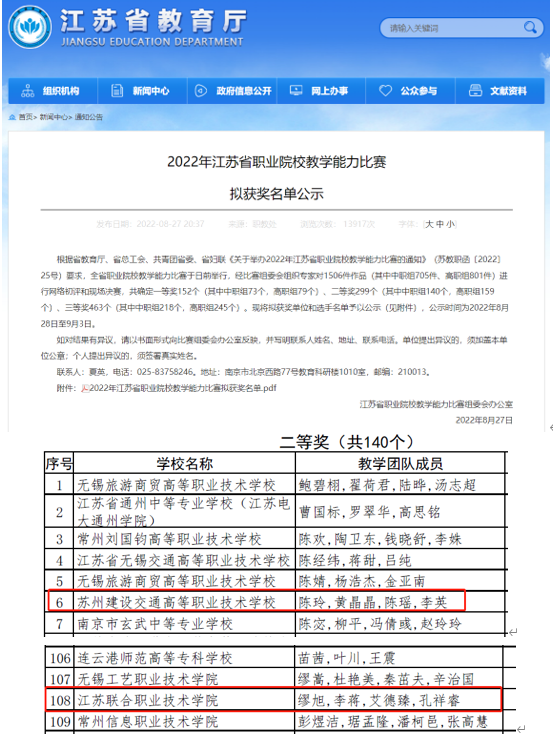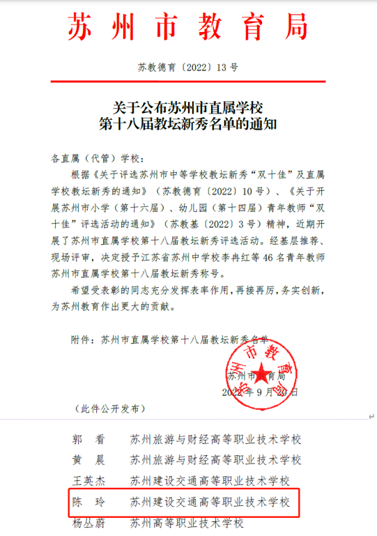 近日,苏州市教育局发布《关于公布苏州市直属学校第十八届教坛新秀名单的通知》,轨道交通工程系陈玲老师喜获“苏州市直属学校第十八届教坛新秀称号”。这是继我系艾德臻老师获评“苏州市中小学学科带头人”、朱小芹老师获评“苏州市区中小学学科带头人”的又一喜讯。与此同时,朱小芹老师在2022年江苏省职业院校技能大赛中等职业学校班主任能力大赛中获三等奖;陈玲、黄晶晶、陈瑶、李英教学团队在2022年江苏省职业院校教学能力比赛中获二等奖,缪旭、李蒋、艾德臻、孔祥睿教学团队获三等奖;陈瑶、黄晶晶、吴璇教学团队在2022年江苏联合职业技术学院教学能力大赛获高职组一等奖;程焰钢、许小荣老师指导的《枫桥夜泊》作品获苏州市第十三届中等职业学校“文明风采”大赛一等奖、江苏省最佳作品奖,李蒋、李英老师指导学生多个项目在2022年苏州市职业教育创新创业大赛中获三等奖。系部工作展现出蓬勃生机,可谓是全面开花,捷报频传。