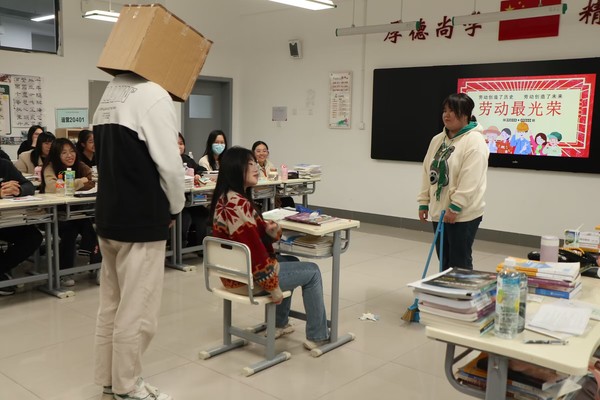 本次主题班会共分为四个部分:志愿服务在我心、劳动从我做起、致敬辛勤劳动者、力所能及的劳动。整个主题班会以学生为主体,班主任陈玲老师以班级同学的志愿服务引入,帮助学生了解未来专业岗位需求,期间穿插视频、小品、小游戏,通过活动寓教于乐,促进学生从自身发现劳动无处不在,劳动要从我做起。通过身边的劳动模范,激发学生的学习热情,让爱岗敬业深扎于心,最后一个环节是由班主任陈玲老师进行总结提升,将班级的劳动视频展示给学生,并进行课堂的延伸,每学期进行劳动之星的评比,培养学生志愿奉献精神,传承劳动精神,创造美好生活,使主题更加深化。(图/史俊瑶 文/许小荣)