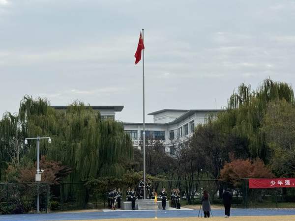 晨光中,国旗护卫队步伐铿锵,五星红旗在庄严的国歌声中冉冉升起,全体师生肃立行注目礼,场面庄严肃穆。